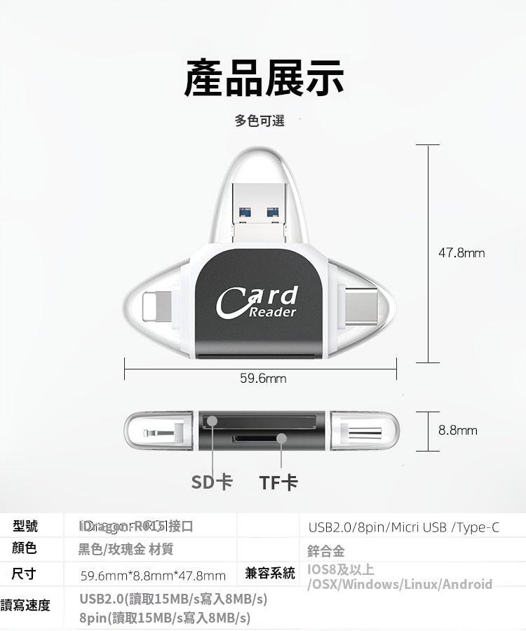 半小時前多功能讀卡器適用於蘋果安卓手機 - 【優惠價】四合一多功能讀卡機 一入組 NT$788